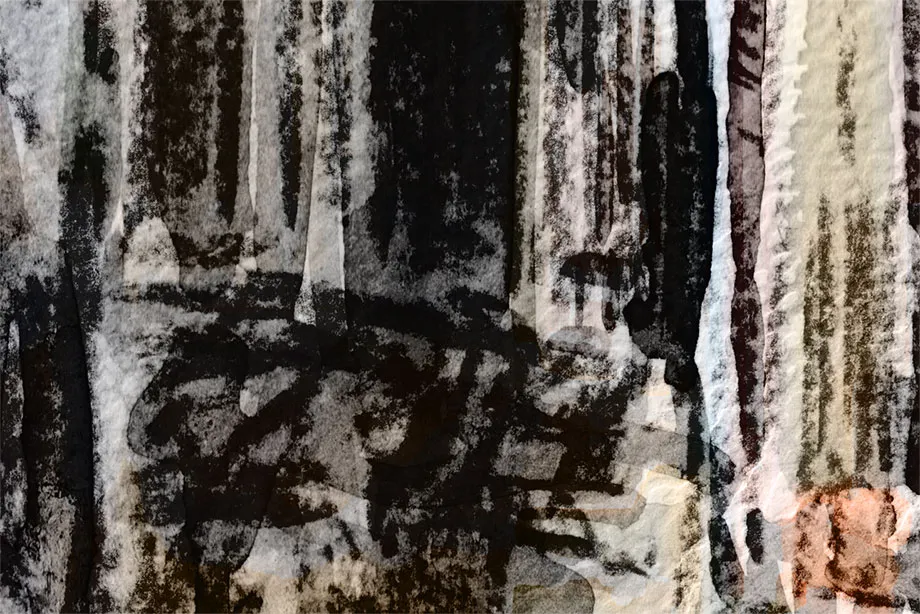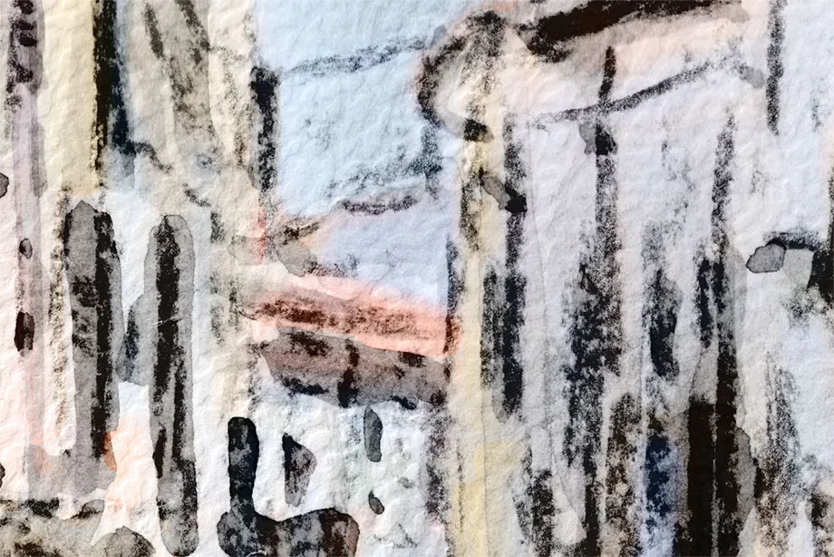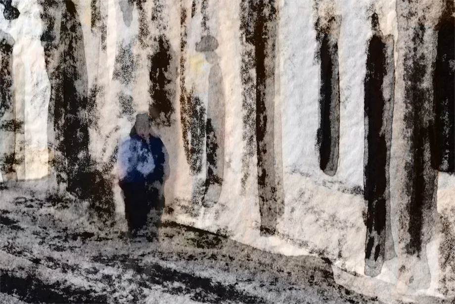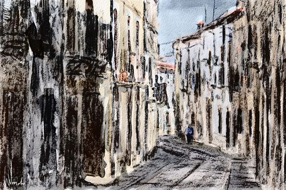 On a hot summer afternoon, a man walks calmly through a small street in Trujillo. The moment is captured in a sketch-like artwork that combines simplicity and atmosphere. The use of black, including in the houses, creates an almost organic and natural effect. This results in a lively, fluid composition that still emphasizes the calmness of the moment.